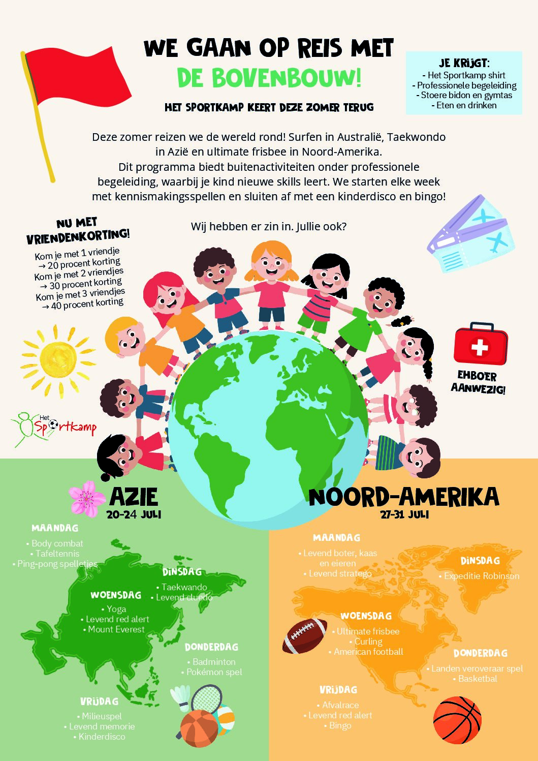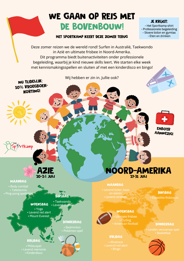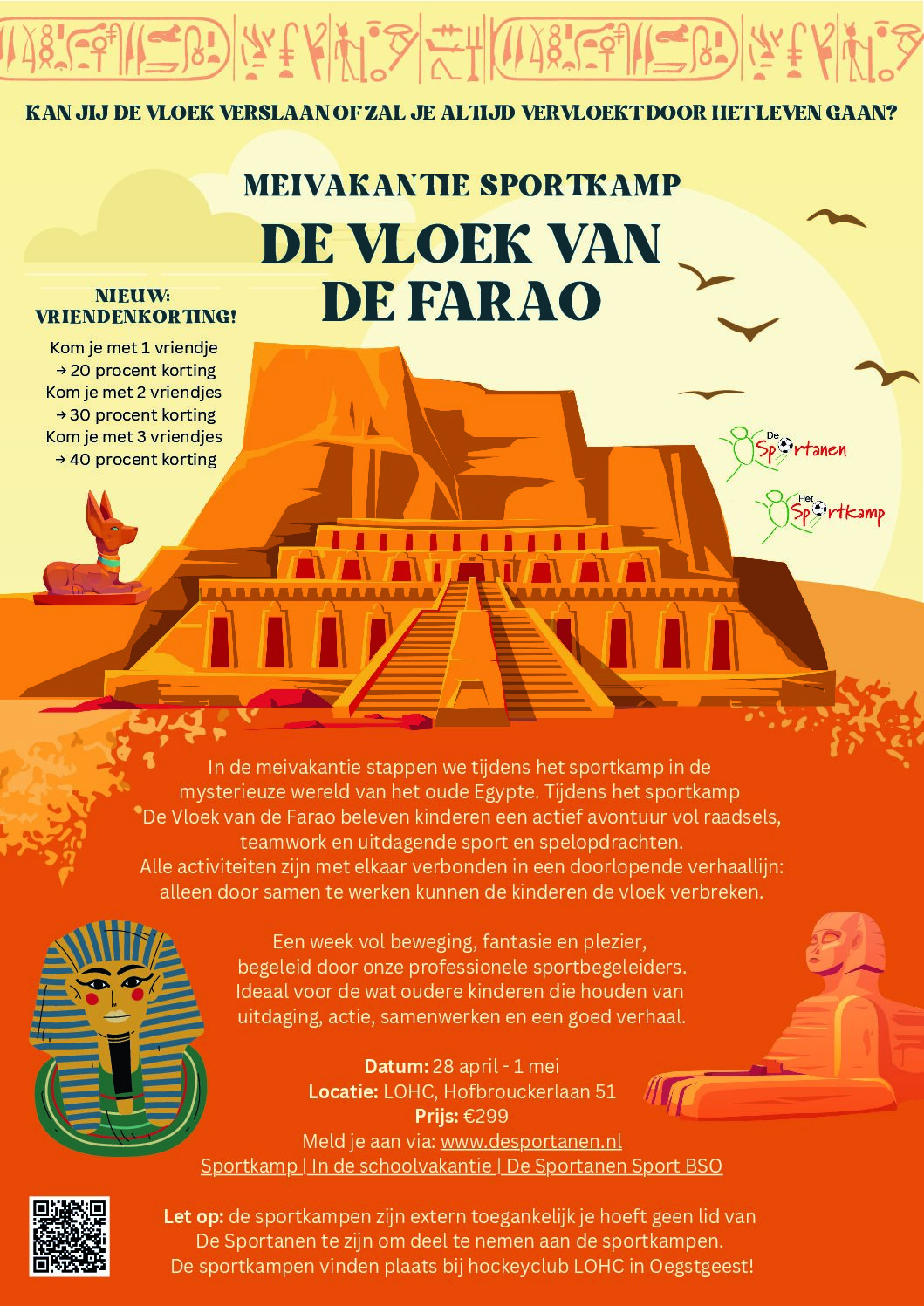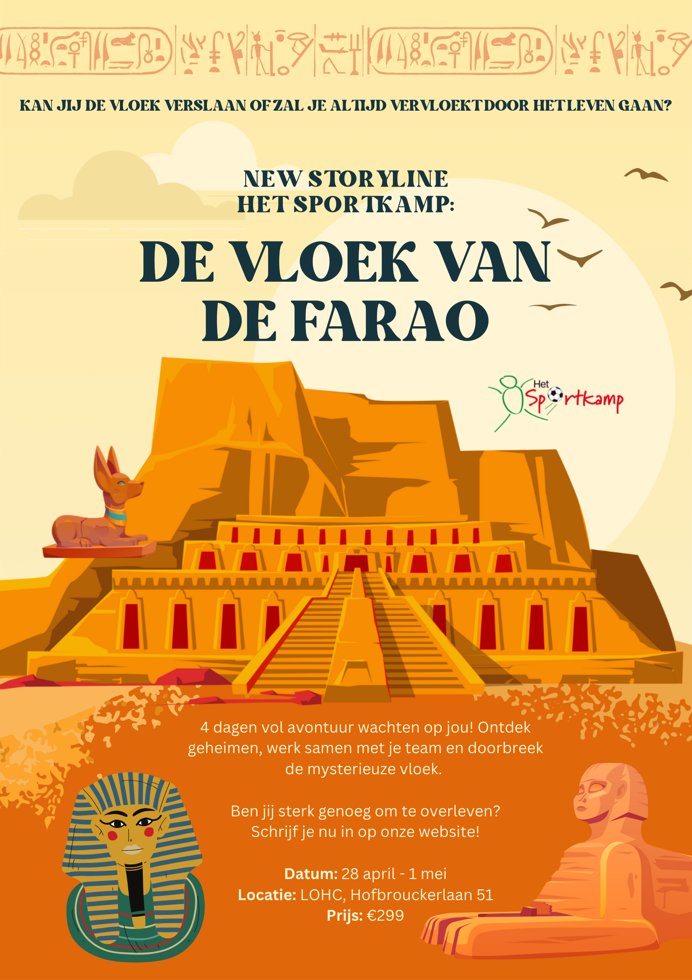 Tijdens onze sportkampen staat er altijd een thema centraal. In de meivakantie reizen we naar het oude Egypte voor het spannende kamp ‘De Vloek van de Farao’. Tijdens de zomervakantie maken we een reis om de wereld en staat iedere week in het teken van een ander continent. De sportkampen hebben een echte storyline: elke dag beleven de kinderen een nieuw hoofdstuk vol uitdagingen en verrassingen. We bieden een afwisselend programma waarin kinderen kennismaken met verschillende sporten, teamwork ontwikkelen en vooral heel veel plezier hebben. De sport en spelactiviteiten staan uiteraard in het teken van het thema van de week.